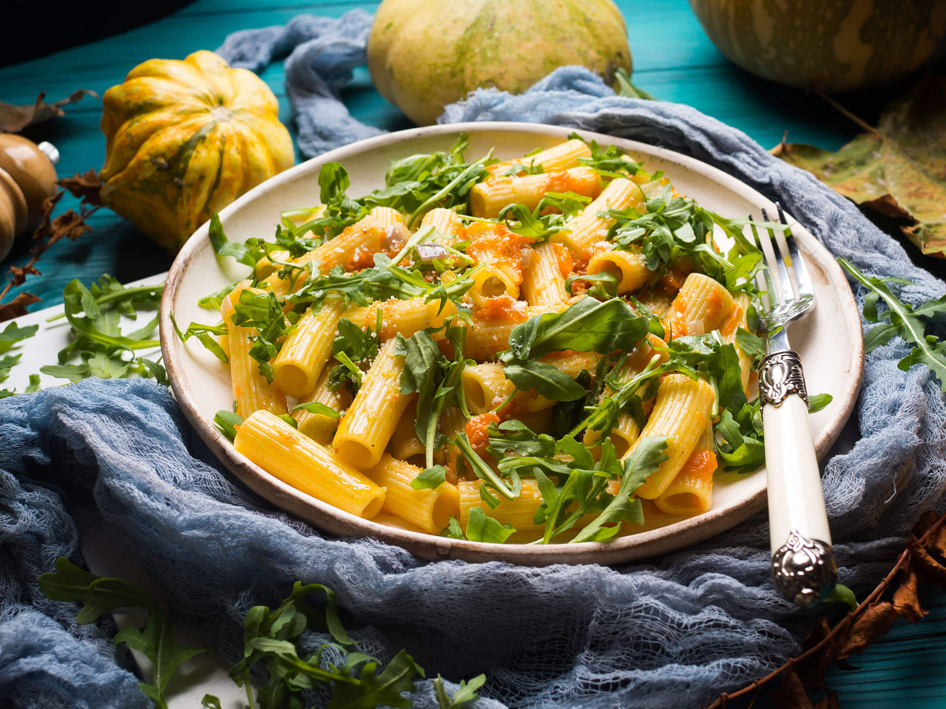 Este plato de pasta combina el rico sabor de la calabaza con la rúcula picante para una comida deliciosa y satisfactoria. Es fácil de hacer y perfecto para una cena acogedora de otoño.