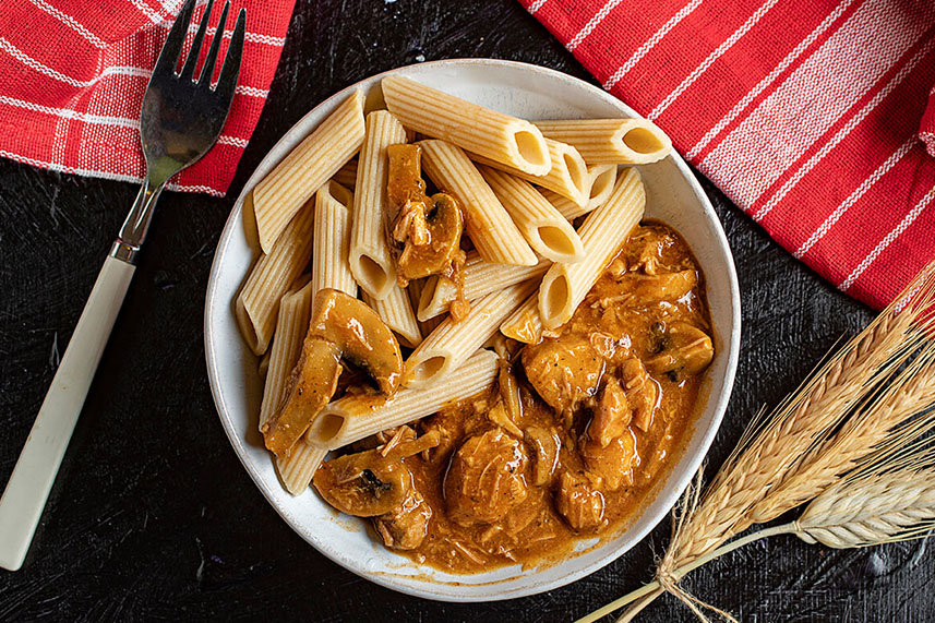 Este plato de pasta abundante y sabroso combina cerdo tierno, champiñones terrosos y pasta penne al dente en una salsa sabrosa. Es una comida satisfactoria perfecta para una cena acogedora en casa.