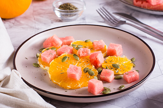 Fruit Salad of Watermelon Orange and Pumpkin Seed